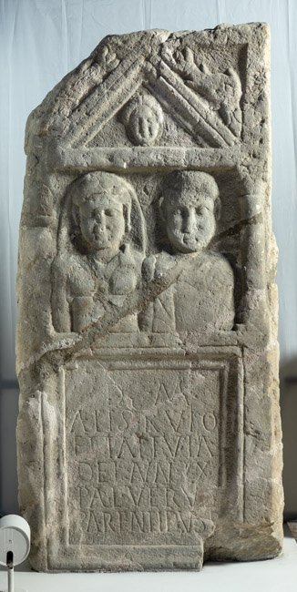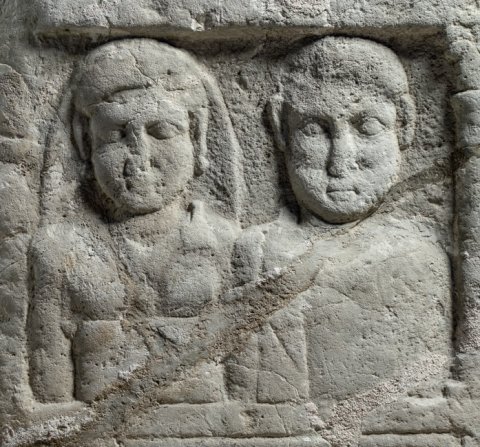 - Eingeschriebener Giebel mit Gorgoneion, über den Giebelschrägen Delphine. Bildfeld zwischen Säulen: zwei Halbfiguren (Ehepaar), links einheimische Frau mit Schleier, Fibeln, Gürtel, rechts Mann im Sagum.