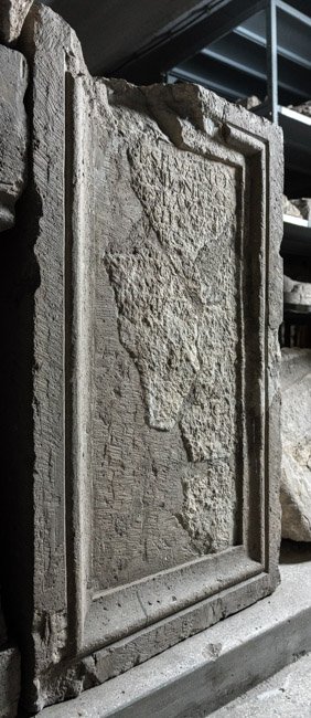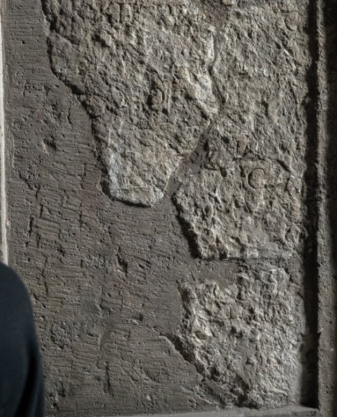 - zerbrochen, Teile der Inschrift fehlen, auf der Oberseite Dübelloch