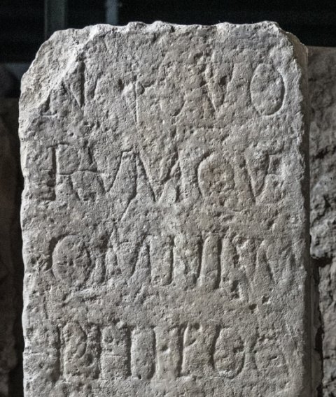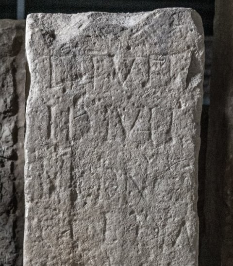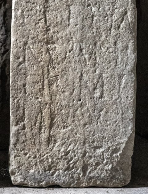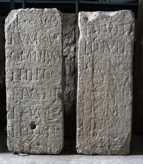 - 2 Blöcke, die übereinander standen. Verwaschen, bestoßen. Anfang der Inschrift stand auf einem 3. (verlorenen) Block.