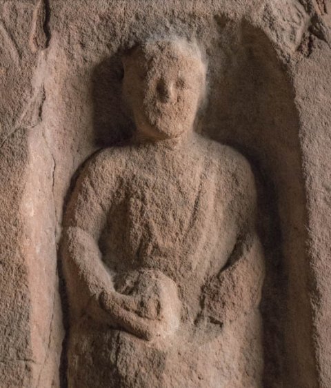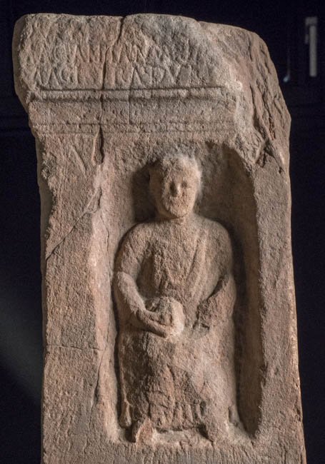 - Mythische Figur: in der Vorderseite des Schaftes Bogennische mit sitzender ganzfiguriger Göttin in Ärmelgewand und Mantel, in den Händen Attribut. Inschrift auf dem Aufsatz.