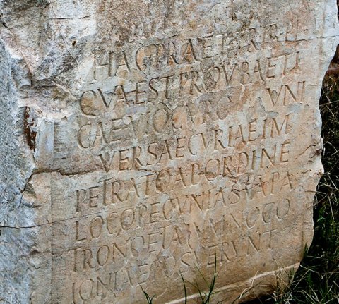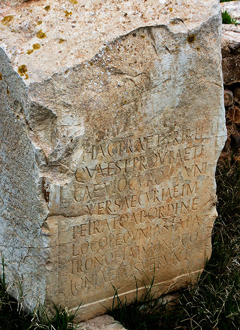 - --- leg(ato) Kar]/thag(inis) praet(ori) trib(uno) pl(ebis) / quaest(ori) prov(inciae) Baeti/cae viocuro uni/versae curiae im/petrato ab ordine / loco pecunia sua pa/trono et alumno co/loniae posuerunt
