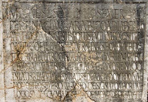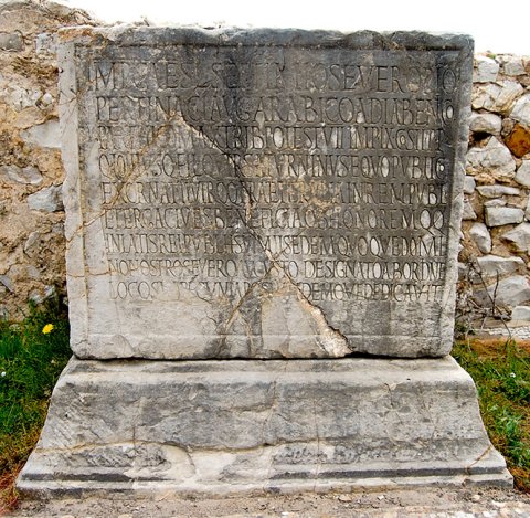 - Imp(eratori) Caes(ari) L(ucio) Septimio Severo Pio / Pertinaci Aug(usto) Arabico Adiabenico / Parthico max(imo) trib(unicia) potest(ate) VII imp(eratori) IX co(n)s(uli) II p(atri) p(atriae) / Q(uintus) Lollius Q(uinti) fil(ius) Quir(ina) Saturninus equo publico / exornat(us) IIvir q(uin)q(uennalis) praeter alia in rem publ(icam) / et erga cives beneficia ob honorem q(uin)q(uennalitatis) / inlatis rei publ(icae) HS VI mil(ibus) sedem quoque domi/no nostro Severo Augusto designato ab ordine / loco sua pecunia posuit idemque dedicavit