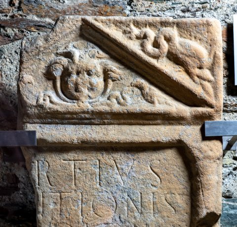 - Eingeschriebener Giebel mit Gorgoneion zwischen Vögeln, auf den Schrägen Delphine. Schriftfeld zwischen Säulen.