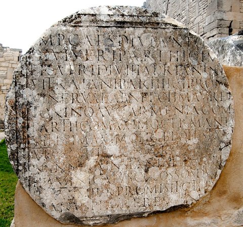 - Imp(eratori) Caes(ari) divi Anton[ini filio] / divi Veri Parthici m[aximi Germ(anici)] / fratri divi Hadriani ne[poti di]/vi Traiani Parthici prone[poti di]/vi Nervae abnepoti M(arco) Aurel[io An]/tonino Aug(usto) Armeniaco Me[dico] / Parthico maximo Germanic[o pon]/tifici maximo trib(unicia) potest(ate) XXV[II imp(eratori)] / VI co(n)s(uli) III p(atri) p(atriae) p[roco(n)s(uli)] / Nanneia Instantia Fida ob h[onorem] / flaminicatus(!) colossos duo[s quos ex] / HS XXX mil(ibus) n(ummum) promisit C(aius) Ter[entius Iu]/[l]ianus proheres d[edit]