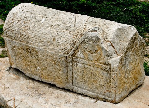 - Massiver Kasten mit Tonnendach. An einer Längsseite Schriftfeld, darüber Giebel mit Rosette, darunter Mondsichel, flankiert von zwei glockenförmigen Gebilden (?).