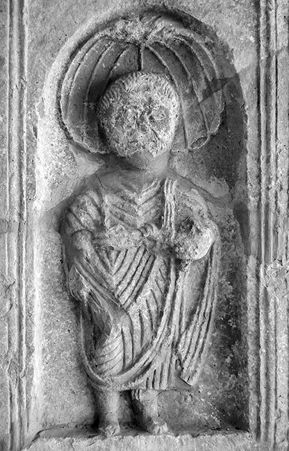 - Giebel mit Kranz, gerahmtes Bildfeld mit Bogennische, darin stehende Ganzfigur eines bärtigen Mannes in Tunica und Mantel (Toga (?), über dem Bogen Girlande.
