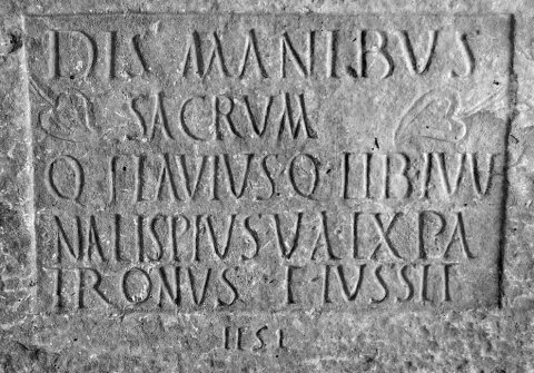- Dis Manibus / sacrum / Q(uintus) Flavius Q(uinti) lib(ertus) Iuv(e)/alis pius v(ixit) a(nnos) LX pa/tronus f(ieri) iussit // h(ic) s(itus) e(st)