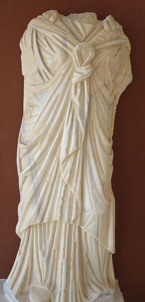 - Mythische Figur: stehende Isis mit Schulterlocken und vor der Brust verknotetem Mantel.