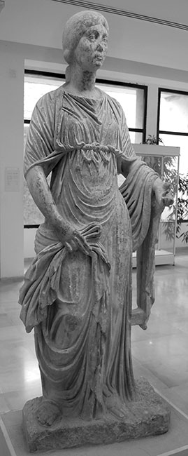 - Grabstatue einer jungen Frau in hoch gegürtetem Chiton, Mantel über den linken Arm und um die Hüften gelegt.