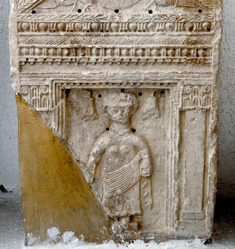 - Mythische Figuren: im Giebel zwei Delphine zwischen Medaillons mit Köpfen, unten Leiste mit Blattornament. Rechteckfeld mit eingeschriebenem Giebel, in den Zwickeln Meerwesen (Triton mit Ruder und Horn, unter dem linken Stern). Im Giebelfeld Kopf mit Strahlenkrone über Mondsichel, flankiert von Tauben. Unter dem Giebel Profilierung mit Eierstab, Zackenfries, Kyma und Zahnschnitt, darunter Tempelfront mit gerahmter Türöffnung zwischen Säulen. In der Tür stehende bekleidete Figur mit Halsband (Göttin ?), seitlich des Kopfes hängende Blütenkelche.