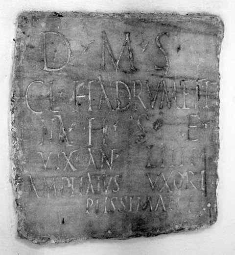 - D(is) M(anibus) s(acrum) / Cl(audia) Hadrumeti/na h(ic) s(ita) e(st) / vix(it) an(nos) LIIII / Ampliatus uxori / piissimae f(ecit)