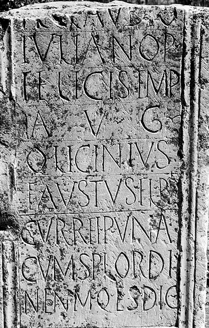 - [D(omino) n(ostro)] / [F]l(avio) Claudio / Iuliano P(io) / Felici semp(er) / Aug(usto) / Q(uintus) Licinius / Faustus fl(amen) p(er)p(etuus) / cur(ator) rei p(ublicae) una / cum spl(endidissimo) ordi/ne n(umini) m(aiestati)q(ue) e(ius) s(emper) dic(atus)