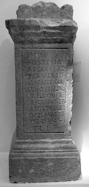 - D(is) M(anibus) s(acrum) / Hostilia / Asclepias / pia vixit / annis XXXV / M(arcus) Hostilius / Q(uinti) f(ilius) Quir(ina) / Reginus lib(ertae) / atque uxori / optimae fe/cit et sibi / t(erra) t(ibi) l(evis) s(it)