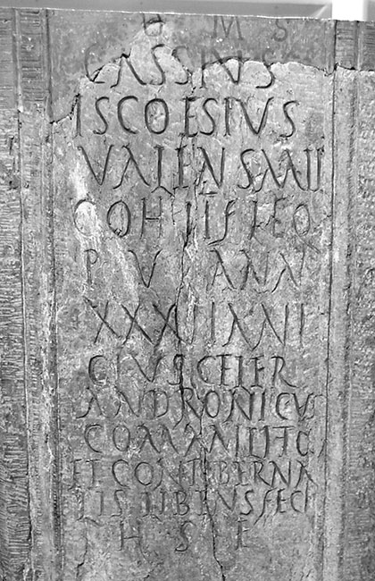 - D(is) [M(anibus) s(acrum)] / Cassius / Iscoesius / Valens mil(es) coh(ortis) II Fl(aviae) eq(uitatae) / p(ius) v(ixit) ann(os) XXXII Ani/cius Celer / Andronicus / commilito / et contiberna/lis(!) libens fecit / h(ic) s(itus) e(st)
