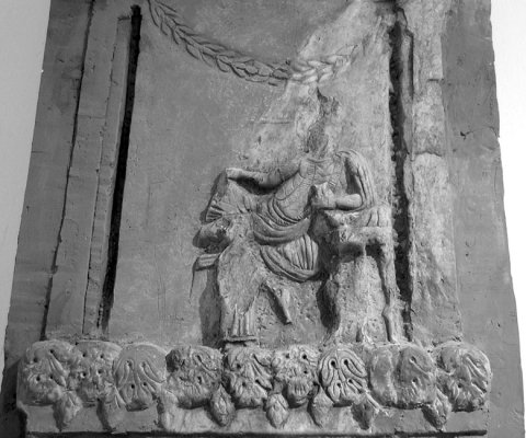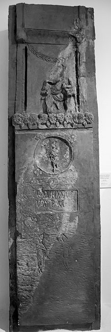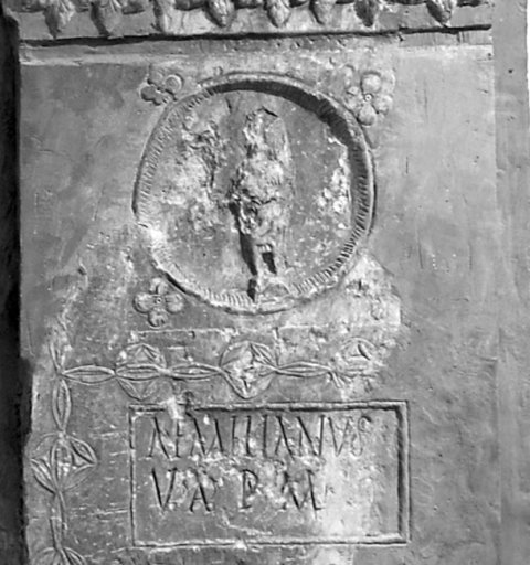 - Oben Rest eines gerahmten Schriftfeldes, darunter Totenmahlrelief: auf Kline gelagerter Mann in Tunica und Mantel, in der Linken Becher. Vor der Kline Tischchen und Mädchen (Dienerin) mit Gefäß in der Linken. Seitlich Säulen, zwischen denen Girlande hängt. Als unterer Rahmen Reihe von Akanthusblättern. Unterhalb Medaillon mit stehender Figur in kurzem Gewand, in der Rechten Zweig (?). Um das Medaillon vier Rosetten. Darunter Schriftfeld, umgeben von Blattornament. Als Sockelbild Ritzzeichnung von zwei stehenden Figuren (nur die linke ganz erhalten: Attis (?) in Trauerhaltung.