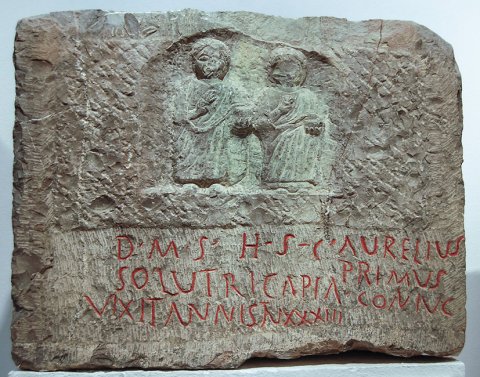 - D(is) M(anibus) s(acrum) h(ic) s(itus) e(st) / Solutrica pia / vixit annis n(umero) XXXIII // Aurelius / Primus / coniuc(i)(!)