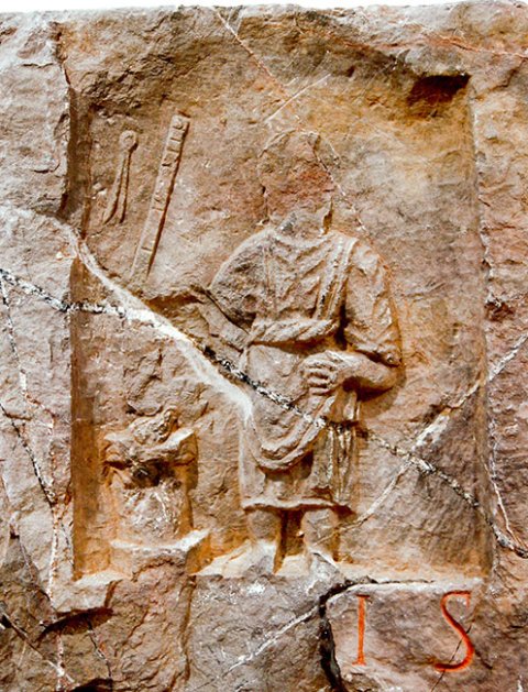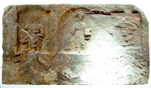 - Über der Inschrift zwei Bildfelder: links Bogennische mit an einem Rundaltar opfernden Mann in Tunica und Mantel, an der Wand Werkzeuge (Zirkel, Maßstab). Im rechten, breiteren Feld stehende Frau in Tunica und Mantel, im linken Arm großes Gefäß, in der gesenkten Rechten ? Rechts außen abgeschlagene Figur auf niedrigem Podest.