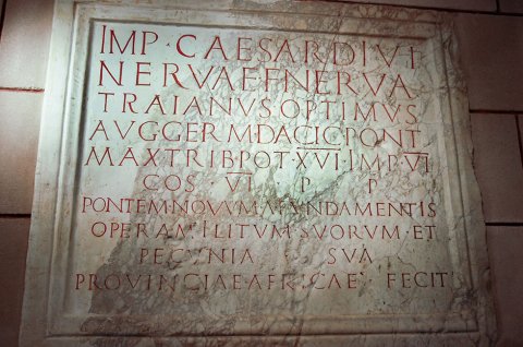 - [Imp(erator) C]aesar divi / [Ne]rvae f(ilius) Nerva / [Tr]aianus Optimus / [Au]g(ustus) Germ(anicus) Dacic(us) pont(ifex) / [ma]x(imus) trib(unicia) pot(estate) XVI imp(erator) VI / co(n)s(ul) VI p(ater) p(atriae) / [pon]tem novum a fundamentis / [op]era militum suorum et / pecunia sua / [p]rovinciae Africae fecit