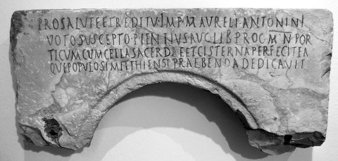- Pro salute et reditu Imp(eratoris) M(arci) Aureli Antonini / voto suscepto Pientius Aug(usti) lib(ertus) proc(urator) m(armorum) N(umidicorum) por/ticum cum cella sacerdae et cisterna perfecit ea/que populo Simittuensi praebenda dedicavit