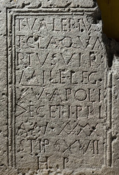 - T(itus) Valerius / T(iti filius) Cla(udia) Qua/rtus Vir(uno) / mile(s) leg(ionis) / XV Apol(l)i(naris) / (centuria) Eceti(i) Pri(mi) / an(norum) XXXX / stip(endiorum) XVII / h(eres) p(osuit)