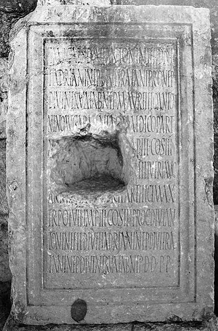 - Imp(eratori) Caes(ari) divi Antonini fil(io) divi / Hadriani nep(oti) divi Traiani pronep(oti) / divi Nervae abnep(oti) M(arco) Aurellio(!) Anto/nino Aug(usto) Armeniaco Medico Part(hico) / m[ax(imo) p(ontifici) m(aximo) tr(ibunicia) pot(estate) XXI im]p(eratori) III co(n)s(uli) III / p[roco(n)s(uli) fratri L(uci) Au]relli(!) Veri Aug(usti) / Armen[iaci Me]dici Parthici max(imi) / tr(ibunicia) pot(estate) VII imp(eratoris) III co(n)s(ulis) III proco(n)s(ulis) divi An/tonini fil(ii) divi Hadriani nep(otis) divi Tra/iani pronep(otis) divi Nervae abnep(otis) d(ecreto) d(ecurionum) p(ecunia) p(ublica)