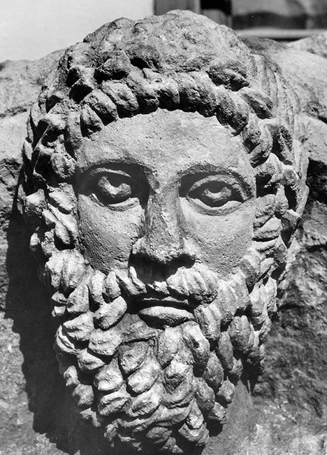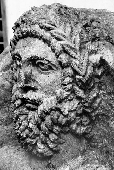 - Mythische Figur: Büste eines bärtigen Gottes (Jupiter ?) mit Lorbeerkranz, Mantel auf der linken Schulter.