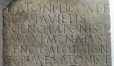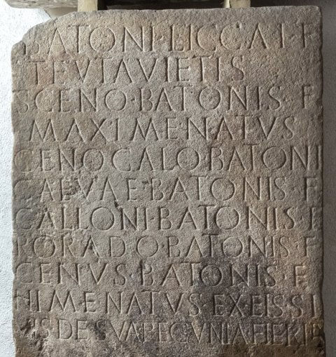 Batoni Liccai f(ilio) / Teuta Vietis / Sceno(!) Batonis f(ilius) / maxime natus / [S]cenocalo Batoni[s f(ilio)] / [S]caevae Batonis f(ilio) / Calloni Batonis f(ilio) / [P]rorado Batonis f(ilio) / [S]cenus Batonis f(ilius) / [mi]nime natus ex eis si[bi et] / [s]uis de sua pecunia fieri iu[ssit]