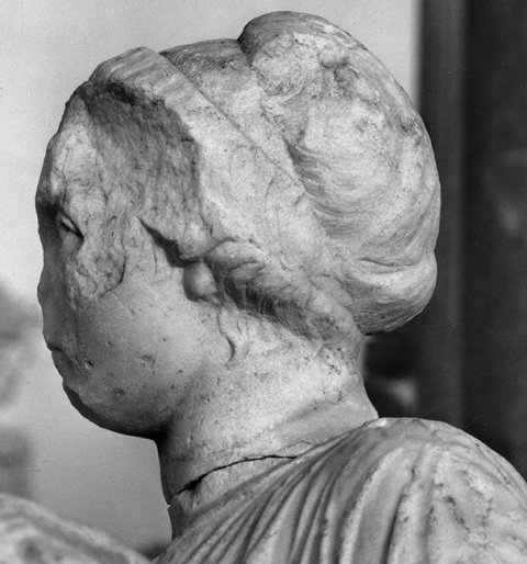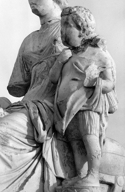 - Mythische Figur - Historische Person: thronende Göttin Ceres in Chiton und Mantel mit Porträtkopf (Mitglied der Severer-Dynastie ?). An ihrer linken Seite auf einem Kelch aus Akanthusblättern stehender Knabe in kurzer Tunica, Mantel und Schuhen.