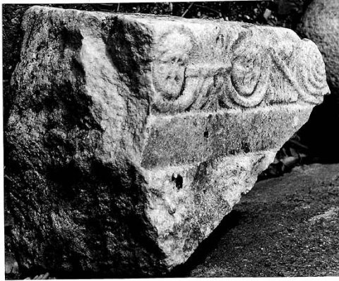 - Auf der Vorderseite zwei gegenständige Volutenranken, in den inneren Voluten links bärtiger, rechts bartloser Kopf. Teil eines Grabaltars ?