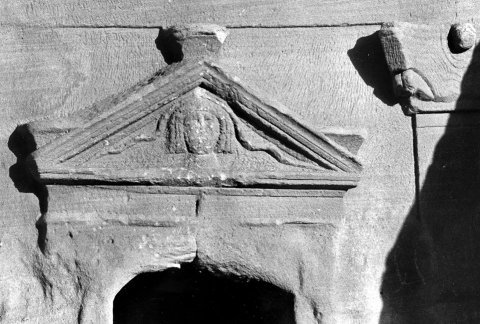 - Glatte Pilaster mit Kapitellen, darüber Architravzone. Tür mit Architrav und Giebel, im Giebelfeld weibliche Maske zwischen Schlangen, auf den Giebelecken Sockel für Akrotere.