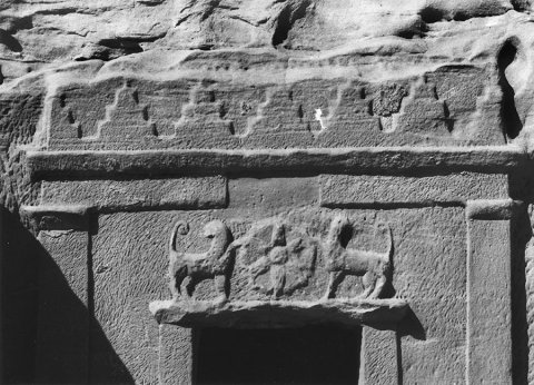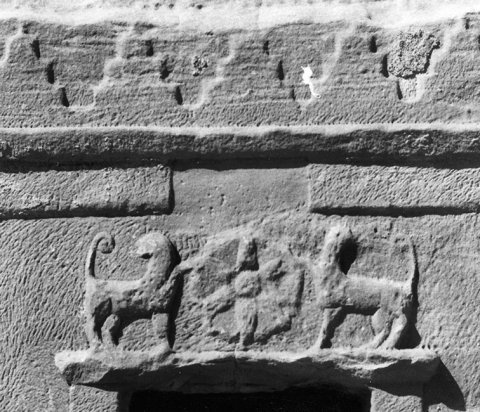 - Glatte Eckpilaster, darüber stilisierte Architravzone und Fries mit Stufenornament. Über dem Türsturz zwei stehende Löwen, zwischen ihnen eine Rosette.