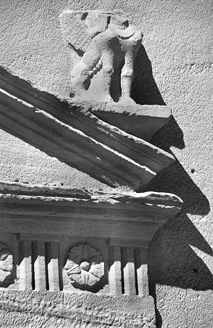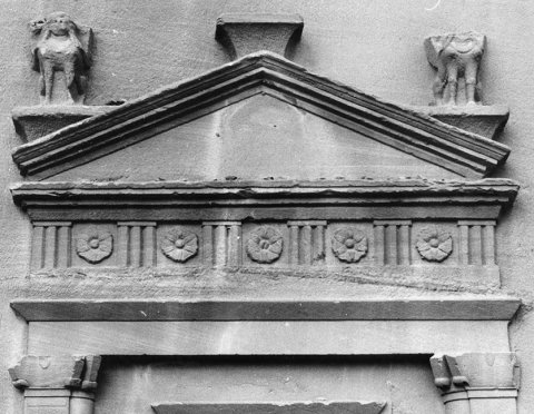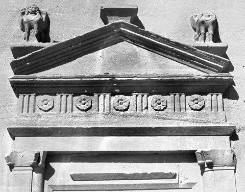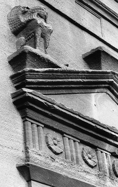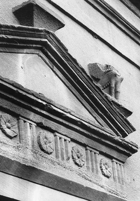 - Tür zwischen Halbsäulen und Pilastern, Architrav mit Metopenfries, in den Metopen Rosetten. Giebel mit Spingen als Seitenakroteren, Sockel für Mittelakroter leer.