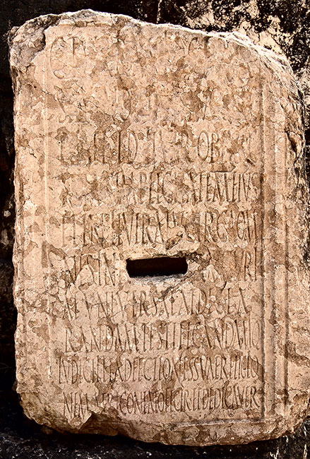- C(aio) Turranio C(ai) f(ilio) Quir(ina) / Silvano fl(amini) Aug(usti) q(uaestori) arc(ae?) / praef(ecto) i(ure) d(icundo) IIviro ob insig/nem simplicitatem eius / et in IIviratum erga om/nes inn[ocenti]am curi/ae universae at decla/randam testificandamq(ue) / iudicii et adfectionis suae religio/nem aere conlato fecer(unt) et dedicaver(unt)
