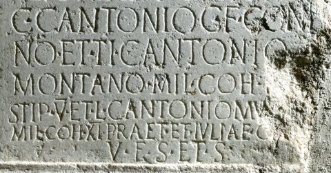 - C(aio) Cantonio Ucc[o] / aed(ili) et Iuliae Bard[i f(iliae)] / Eliomarae uxori e[t] / C(aio) Cantonio C(ai) f(ilio) Cond[i]/no et Ti(berio) Cantonio [C(ai) f(ilio)] / Montano mil(itibus) coh(ortis) I[--- ] / stip(endiorum) V et L(ucio) Cantonio Mu[--- ] / mil(iti) coh(ortis) XI praet(oriae) et Iuliae C[--- ] / v(ivi) f(ecerunt) s(ibi) et s(uis)