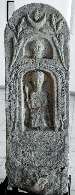 - Stele mit Bogenabschluss. Oben Mondsichel und Pinienzapfen (?), darunter kleine Bogennische mit Kopf eines Mannes (Knabe ?), flankiert von Füllhörnern mit Zweigen und Mohnstängel. Darunter große, von Palmzweigen gerahmte Bogennische mit stehender Ganzfigur einer Frau in Untergewand und Mantel, in der Rechten Blüte (?).