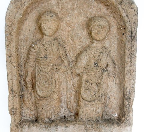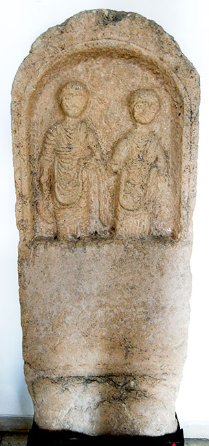 - Ehepaar: Bogennische mit stehenden Ganzfiguren, links Mann in Toga, in der Rechten Vogel (?), rechts Frau in Tunica und Mantel. Inschrift nicht ausgeführt ?