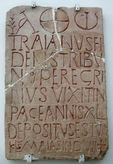 - Traianus fi/delis tribu/nus peregri/nus vixit in / pace annis XL / depositus est VIII / K(a)l(enda)s Maias ind(ictione) VII
