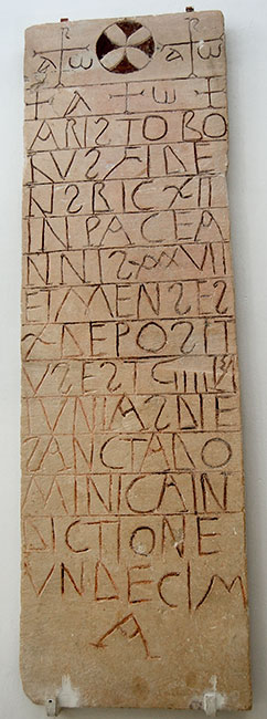 - Aristobo/lus fide/lis bicxit(!) / in pace a/nnis(!) XXXVII / et menses / X deposit/us est VIIII K(alen)d(as) / Iunias die / sancta do/minica in/dictione undecim/a