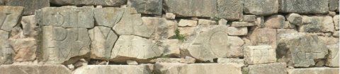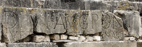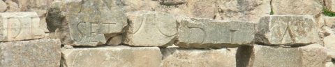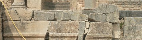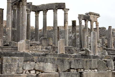 - [P(ublius) M]arcius [Q(uinti) f(ilius) Arn(ensi)] Qu[adr]atus flamen divi Aug(usti) pon[t(ifex) c(oloniae) I(uliae) K(arthaginis)] in qu[inque de]curias adlectu[s a]b Imp(eratore) [A]ntonino Pio Aug(usto) [ob hon]or[em] / [flami]natus [sui perp]etui patriae s[uae theatrum cu]m basilicis et porticu et [x]ysti[s] et scaena cu[m siparis] et or[namentis omni]bus [a solo e]xtructum su[a] pec(unia) f[ec(it) id]emque ludis [s]cae[nicis editi]s et s[portulis datis] et [epulo et gymnasio ded(icavit)]