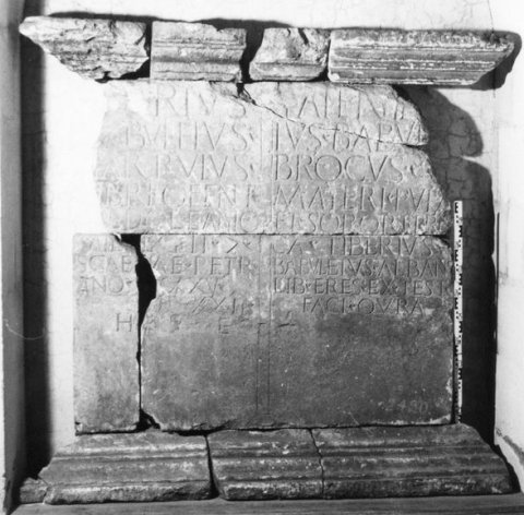 - Ti[b]erius / Babuleius / Garrulus / Tib(e)ri O(u)fent(ina) / Medioleanio(!) / mil(es) [l]eg(ionis) II |(centuria) / Scaevae Petr(oni?) / an(n)o(rum) XXXXV / s[t]ip(endiorum) XXII / h(ic) s(itus) e(st) // Pater Tib[er]/ius Babul[eius] / Brocus / materi Pupa(e) / et sorori Pri[s]/ca(e) Tiberius / Babuleius Albanus / lib(ertus) (h)eres ex test(amento) / faci(endum) qura(vit!)