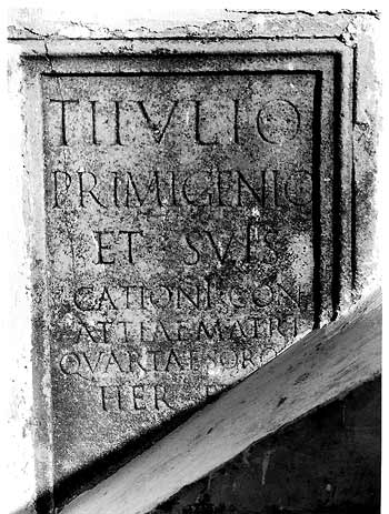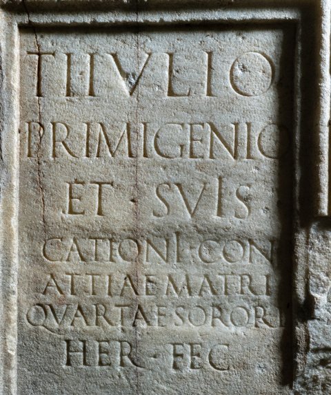 - Ti(berio) Iulio / Primigenio / et suis / Cationi con(iugi) / Attiae matri / Quartae sorori / her(es) fec(it)