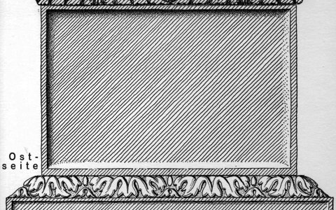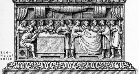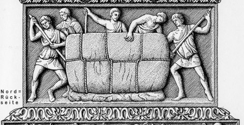 - Auf der Südseite Kontor und Tuchhandlung: links sitzender Mann und mehrere um einen Tisch stehende Männer, davon zwei beim Zählen von Münzen; rechts breiten Männer ein Tuch aus, ganz rechts ein Mann mit Tuchrolle über der Schulter. Auf der Ostseite kein Relief. Auf der Nordseite verschnüren vier Diener ein großes Paket, dahinter ein Schreiber. Auf der Westseite Transport eines Warenpakets auf einem offenen Wagen, der aus einem Stadttor herausfährt.