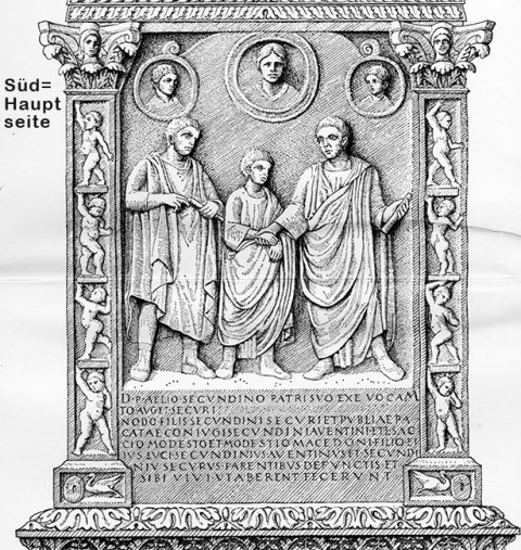 Südseite: unten Schriftfeld, darüber eingetiefte Bildnische mit drei stehenden Ganzfiguren (links Mann in Ärmeltunica und Mantel, in der Mitte Knabe, rechts Mann, beide in Ärmeltunica und Toga. Alle tragen hohe Schuhe, die Männer eine Rolle (volumen) in der Linken). Oben drei Porträtmedaillons (Frau zwischen zwei Kindern).