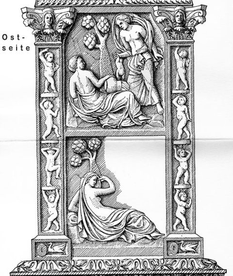 Eckpilaster, in den Sockelfeldern je ein Vogel (Gans ?) und Schild (?), auf dem Schaft je vier Relieffelder übereinander, darin nackte bewegte Knabenfiguren. Kapitelle mit Köpfen, darüber Architrav.