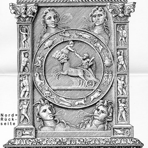 Nordseite: Mythos. Medaillon mit Apotheose des Herakles (Hercules auf Wagen mit Viergespann, reicht Minerva die Hand). Im Medaillonrahmen Tierkreiszeichen. In den Ecken Büsten von Windgöttern.
