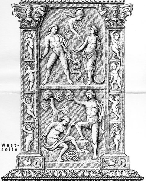 Westseite: Mythos. Im oberen Bildfeld Perseus mit Harpe und Medusenhaupt, Ketos und Andromeda am Felsen, dainter auftauchend Athena. Im unteren Bildfeld Perseus mit Medusenhaupt in der erhobenen Hand, vor ihm sitzende Andromeda (?), zu ihren Füßen Gorgonenkopf (?). - Inschrift