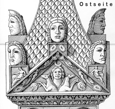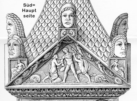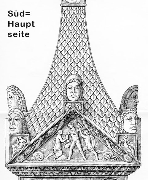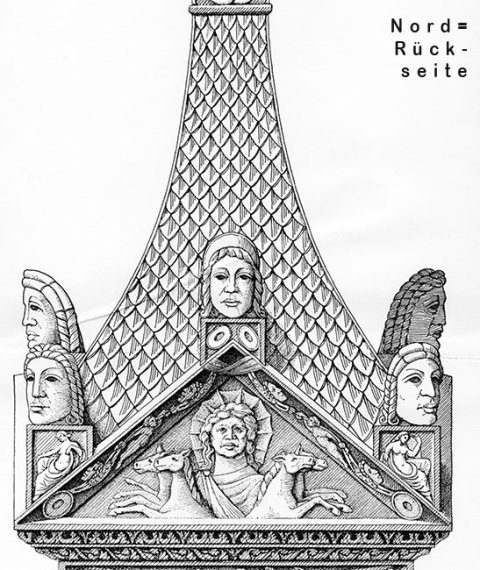 Dach in Form eines geschweiften Pyramidenstupfes mit geschuppter Oberfläche, an der Basis vier Giebel mit Theatermasken als Akrotere. Auf den Sockeln der Seitenakrotere liegende Frauenfiguren. Auf den Rahmen der Giebelschrägen Eroten mit Girlanden und Masken. In den Giebelfeldern Reliefs.