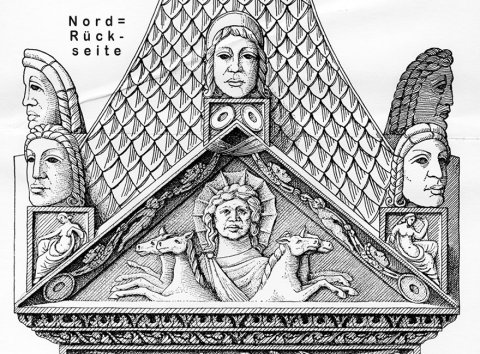 Südseite: Mythos. Hylas und die Nymphen. Ost- und Nordseite: mythische Figur (Büsten von Luna zwischen zwei Maultieren und Sol zwischen vier Pferden. Westseite: Mythos. Mars und Rhea Silvia. - Inschrift