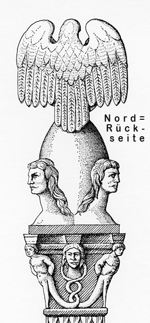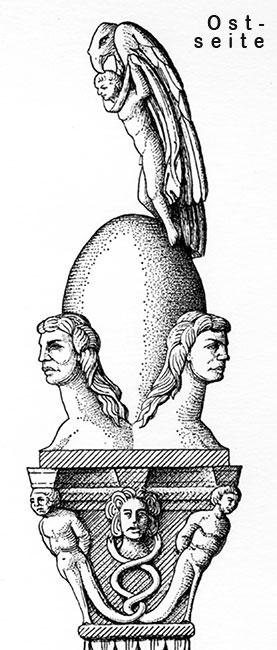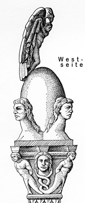 - Mythische Figuren, Mythos. Vierseitiges Kapitell mit schlangenbeinigen Jünglingen an den Ecken, dazwischen menschliche Köpfe. Darüber glatter Pinienzapfen zwischen vier Büsten (Jahreszeiten ?). Auf der Spitze Adler mit Ganymed.