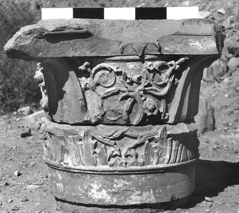 - Kapitell mit Akanthusblattkranz, darüber Ranken. Unten Ansatz des glatten Säulenschaftes.